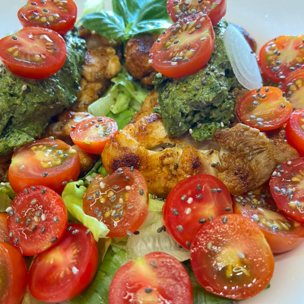 Fresh Italian basil pesto dripped in chicken and topped with lettuce, spring onion and cherry tomatoes